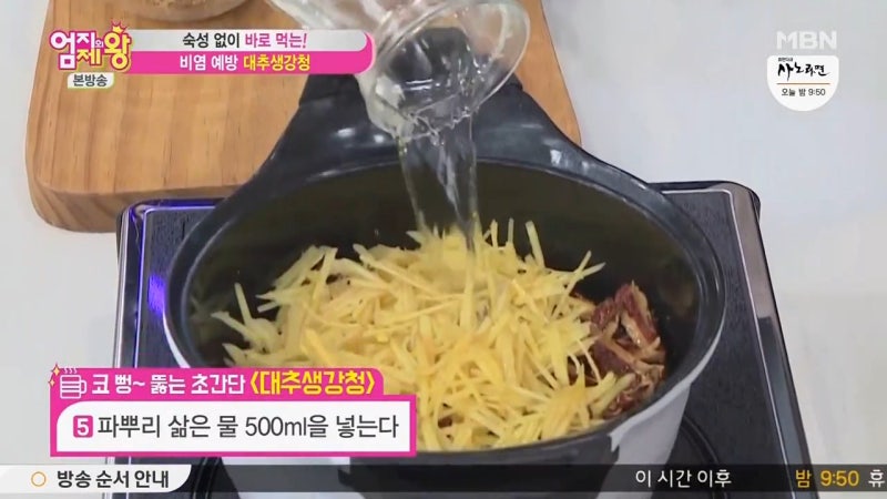 – 냄비에 채썰은 대추 400g과 생강 100g을 넣어줍니다.